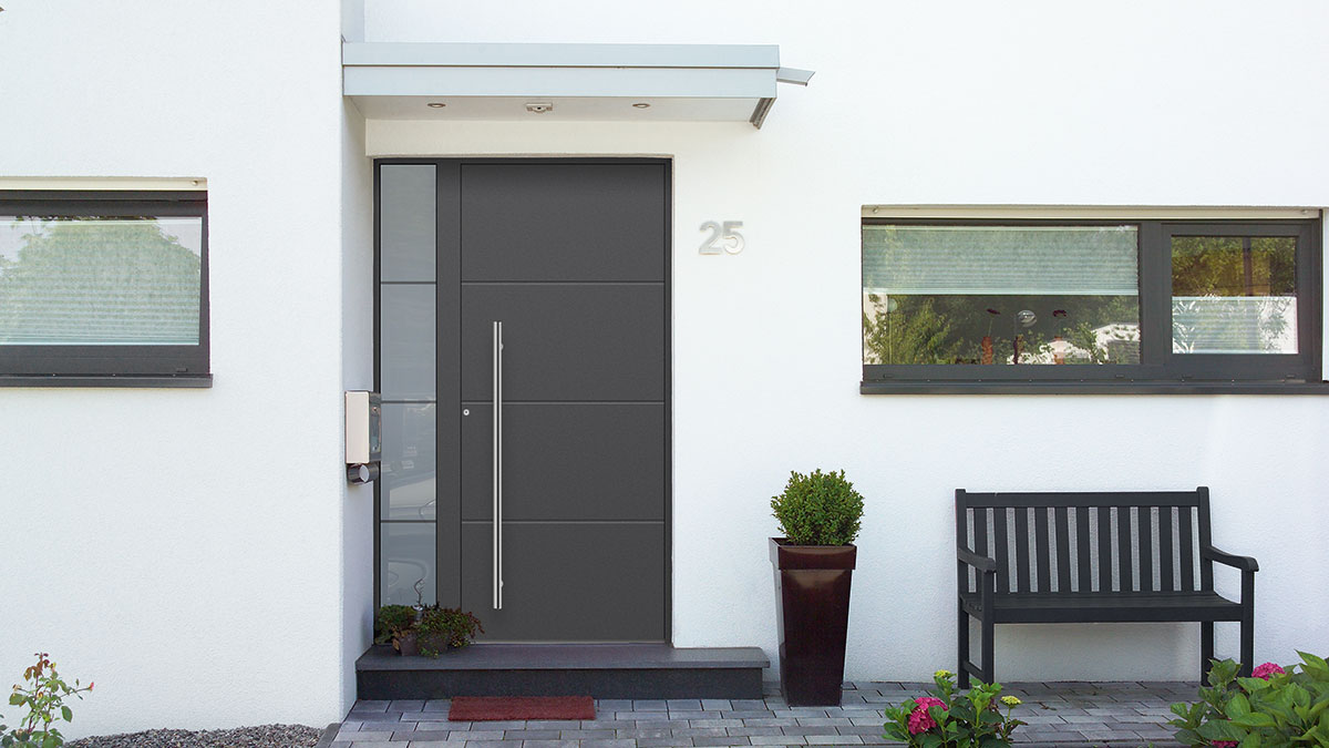 Auch das Vordach in Farbgleichheit zur Haustür ist bei uns eine Selbstverständlichkeit. Wir zeigen Ihnen ein KV 200 Vordach in L-Kombination mit einem multifunktionalen Seitenteil mit integriertem Briefkasten, Klingeln und Sprechanlage in trendigen Farbkombinationen von Grau und Altholz-Optik.